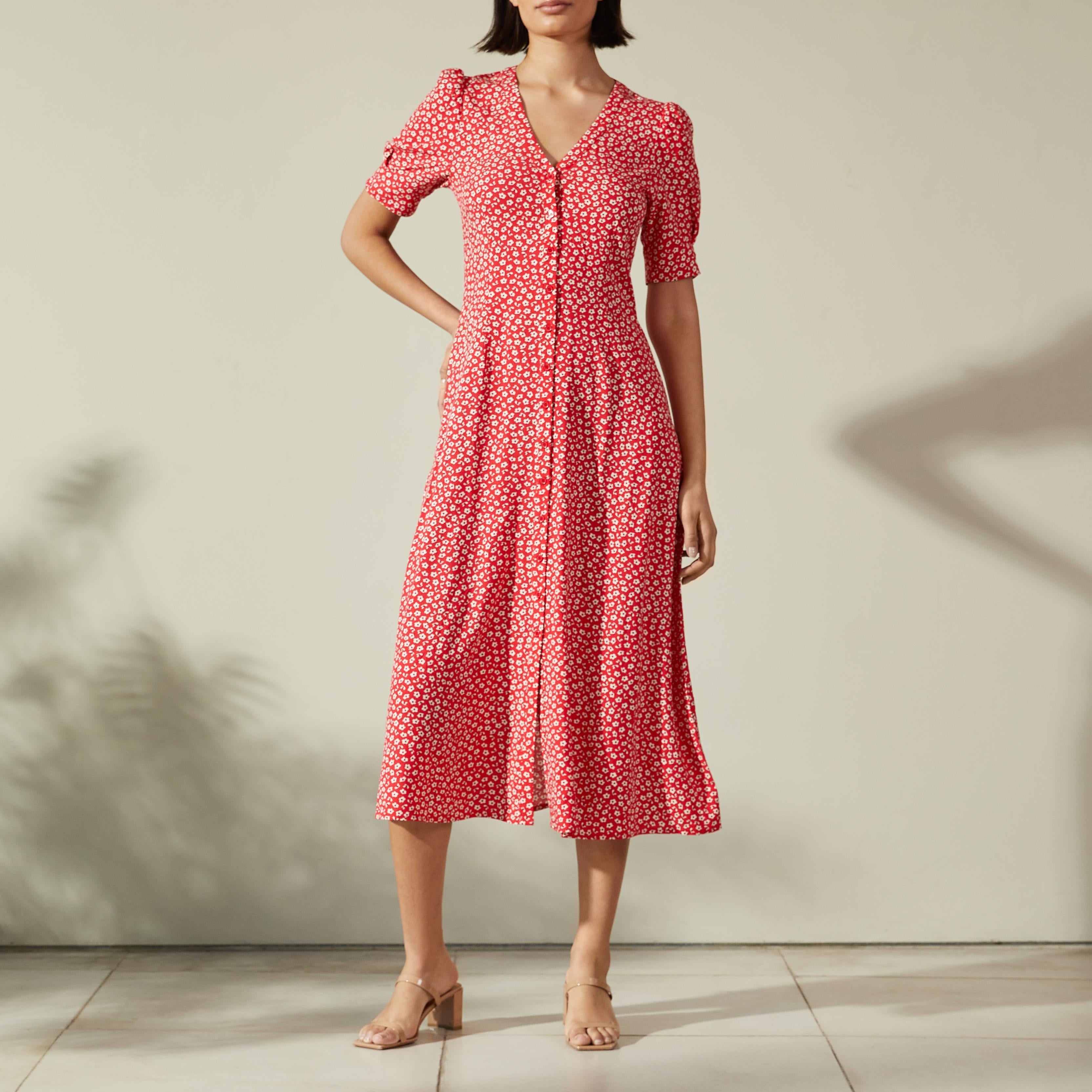 Embrace effortless style with the captivating Floating Floral Tea Dress. This is a button-through midi dress cut with an A-line silhouette that gently skims the body, featuring a V-neck and gently puffed sleeves with soft shirred cuffs.
