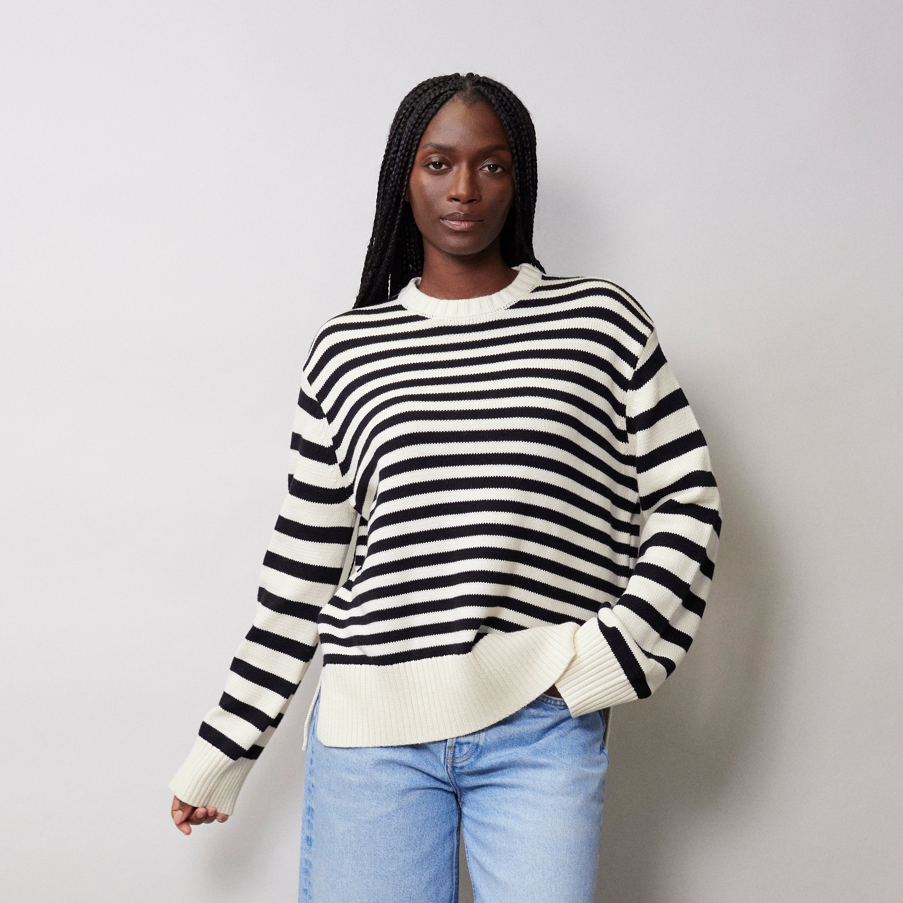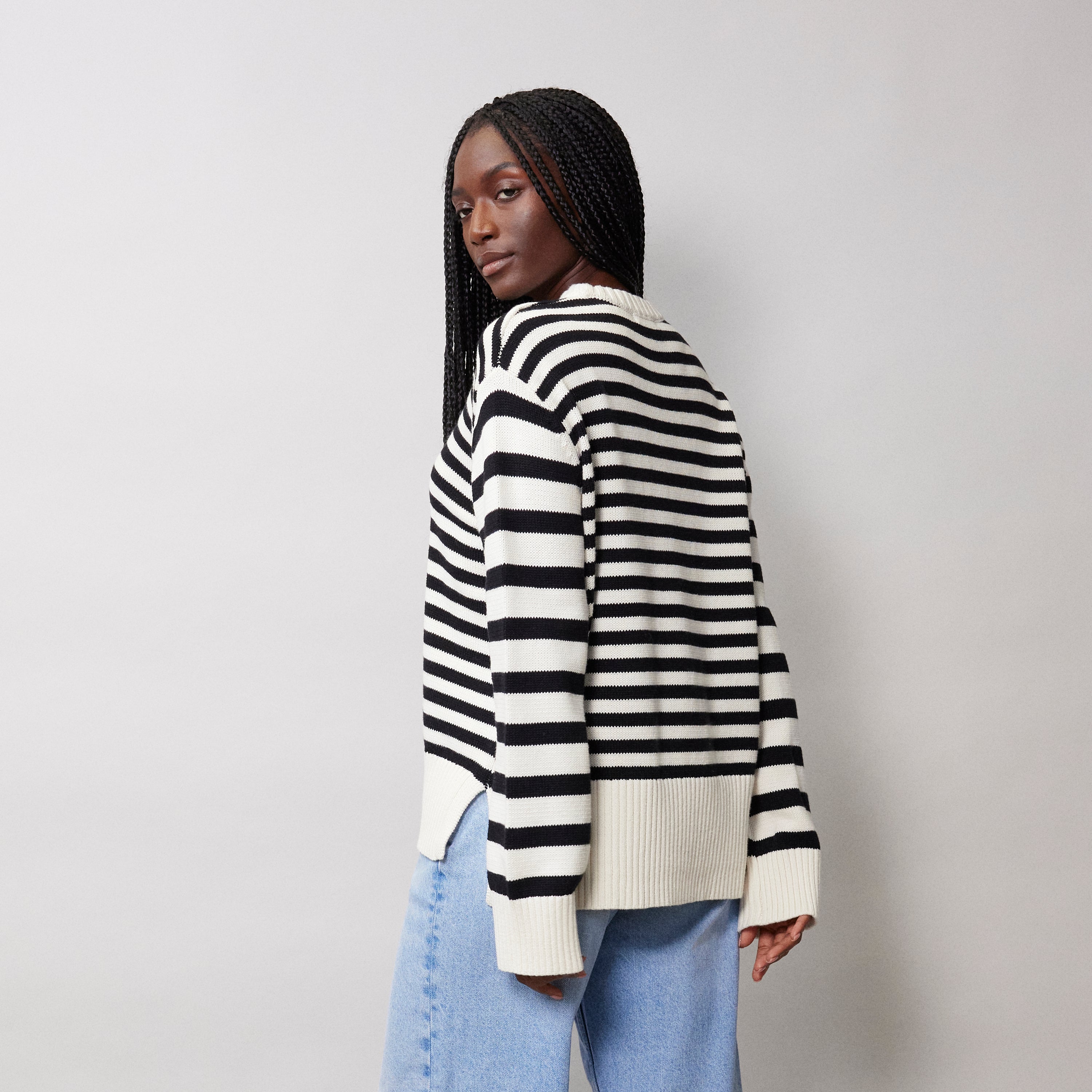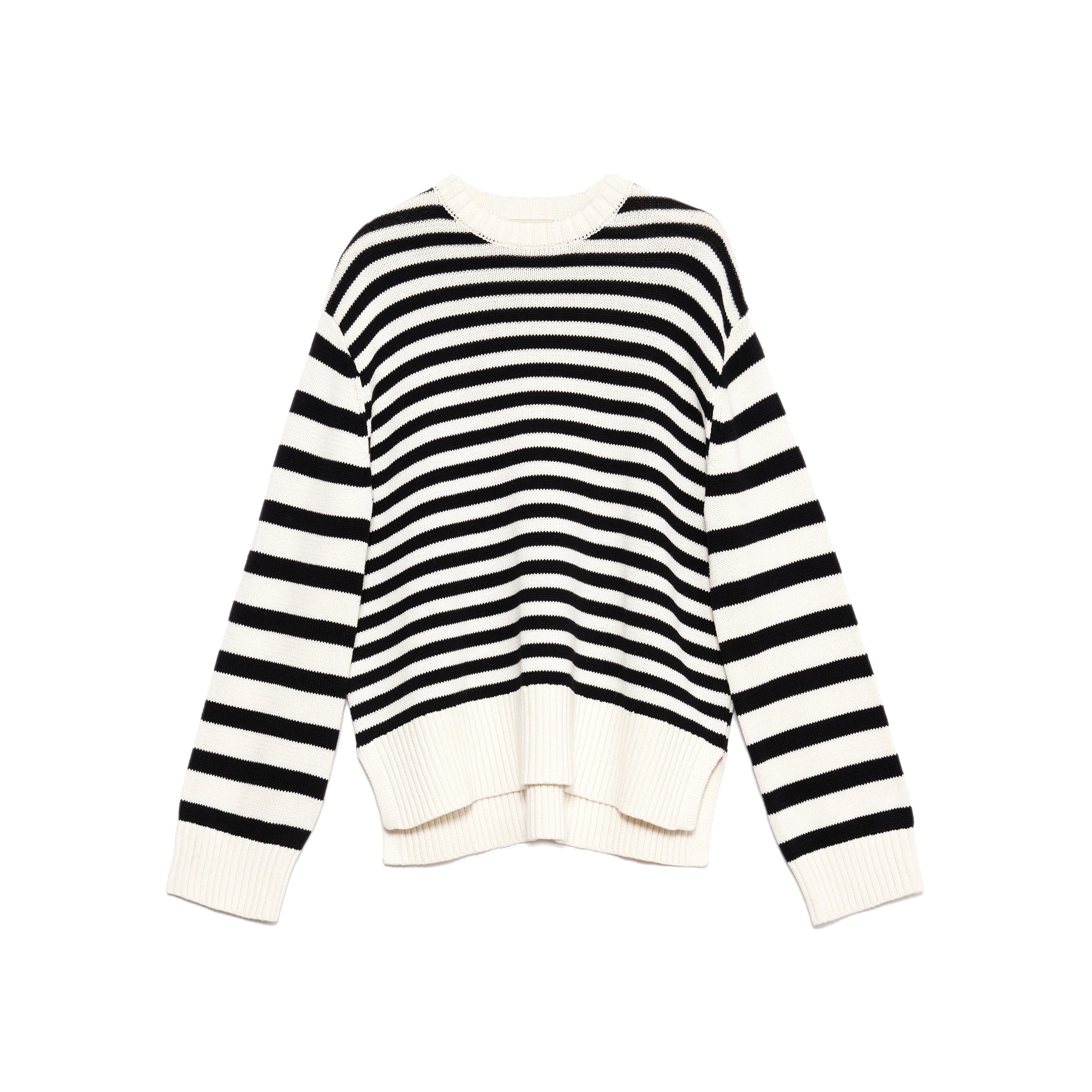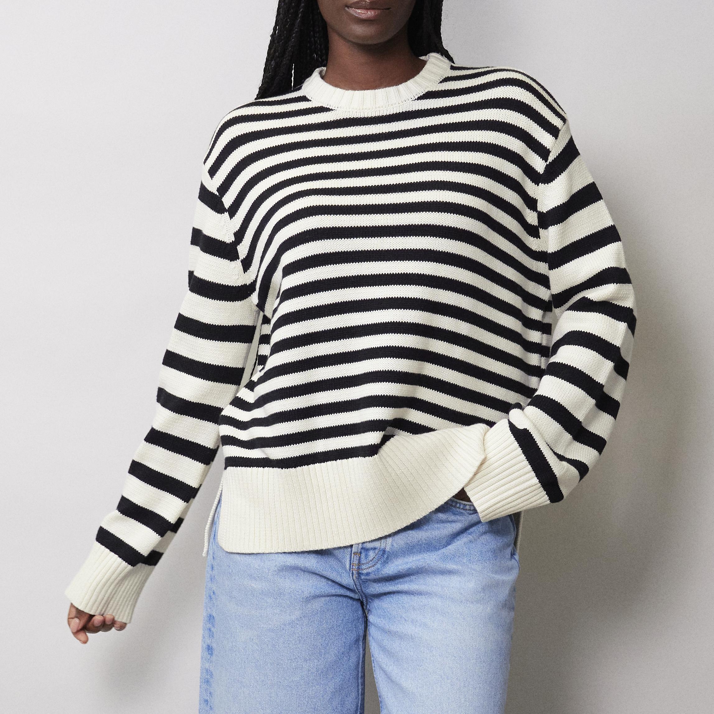 A relaxed crew neck jumper knitted in a soft cotton yarn. In a classic black and cream stripe, it is a timeless wardrobe staple. Featuring cream rib details and a stepped hem with side splits.