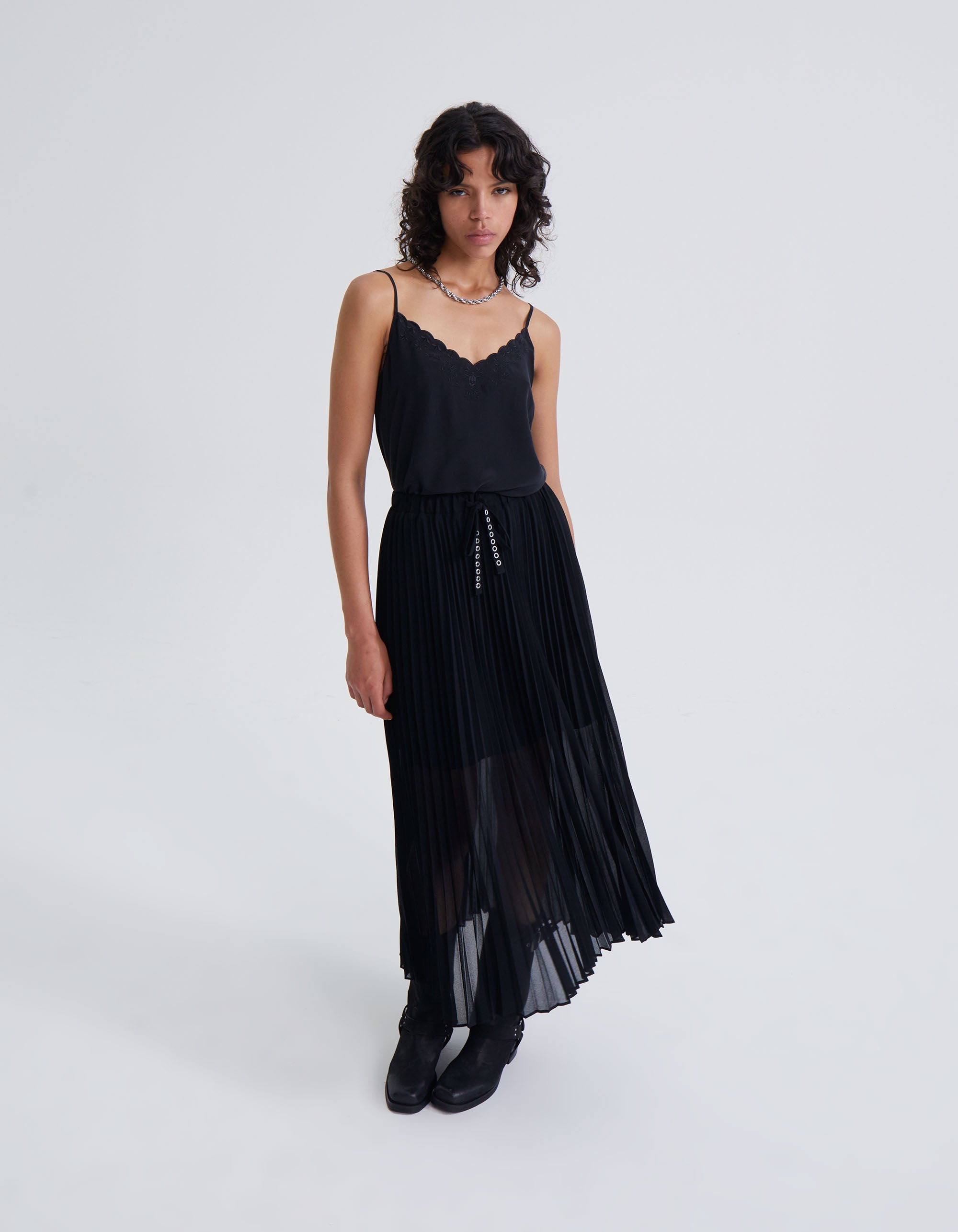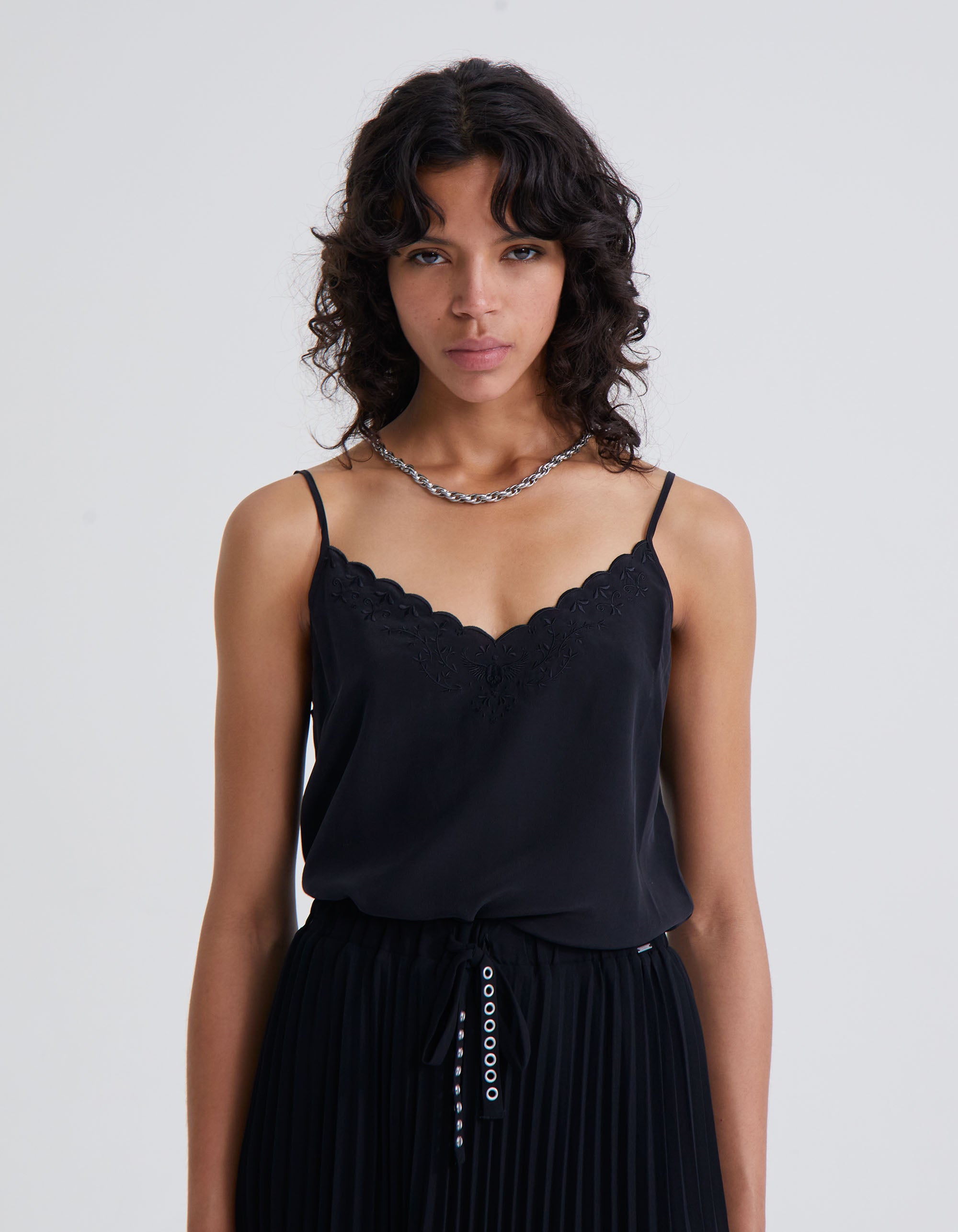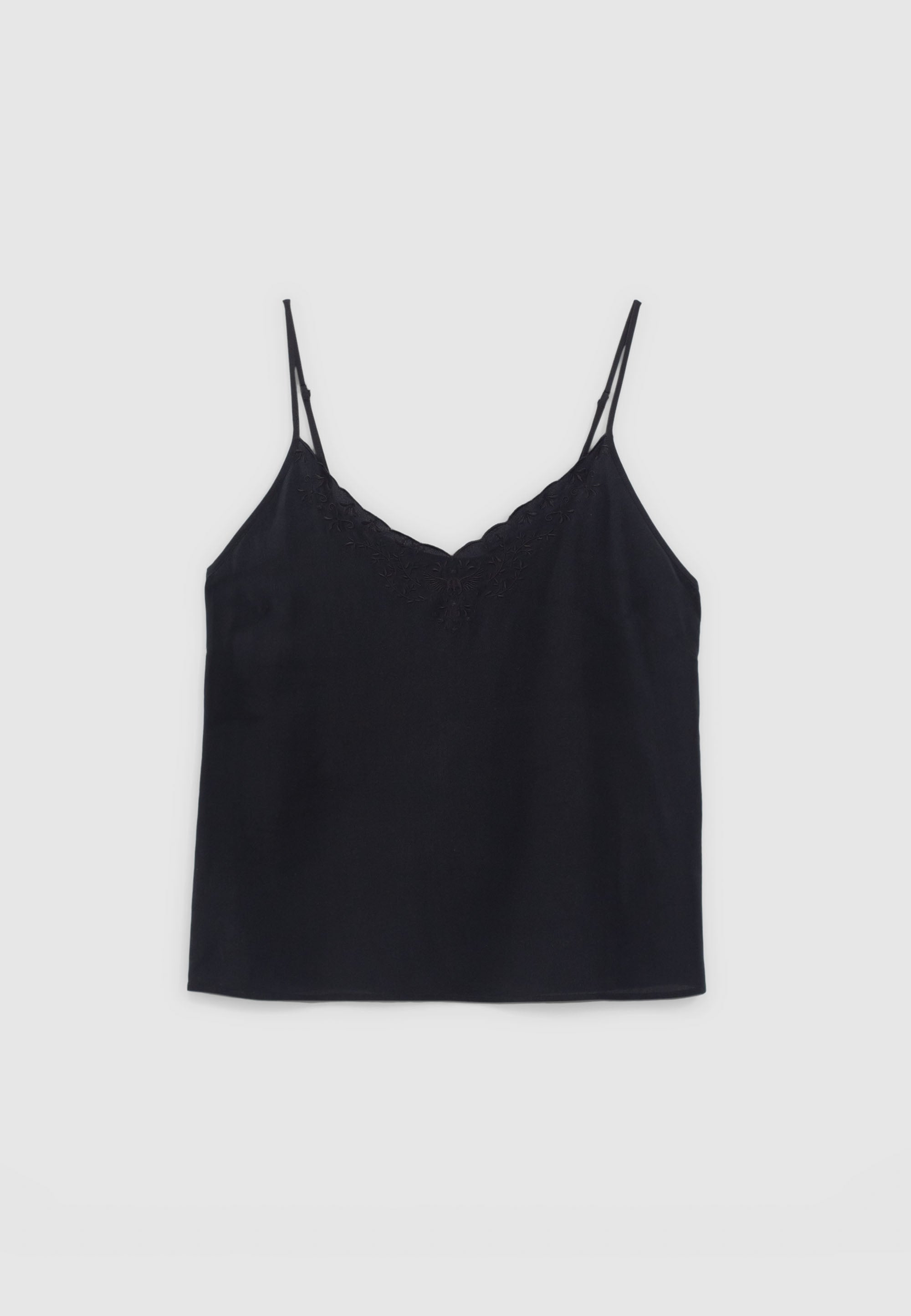 A lovely spaghetti strap silk camisole with embroidery detailing.