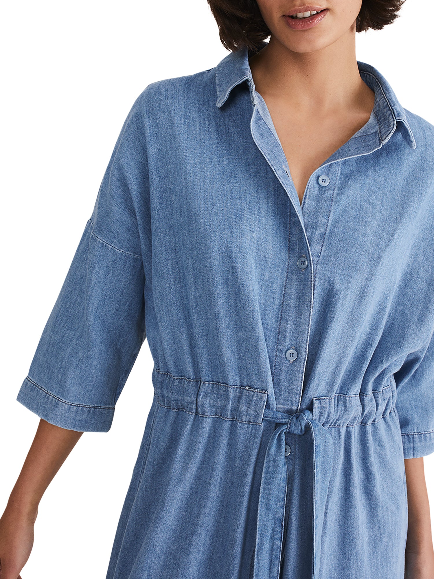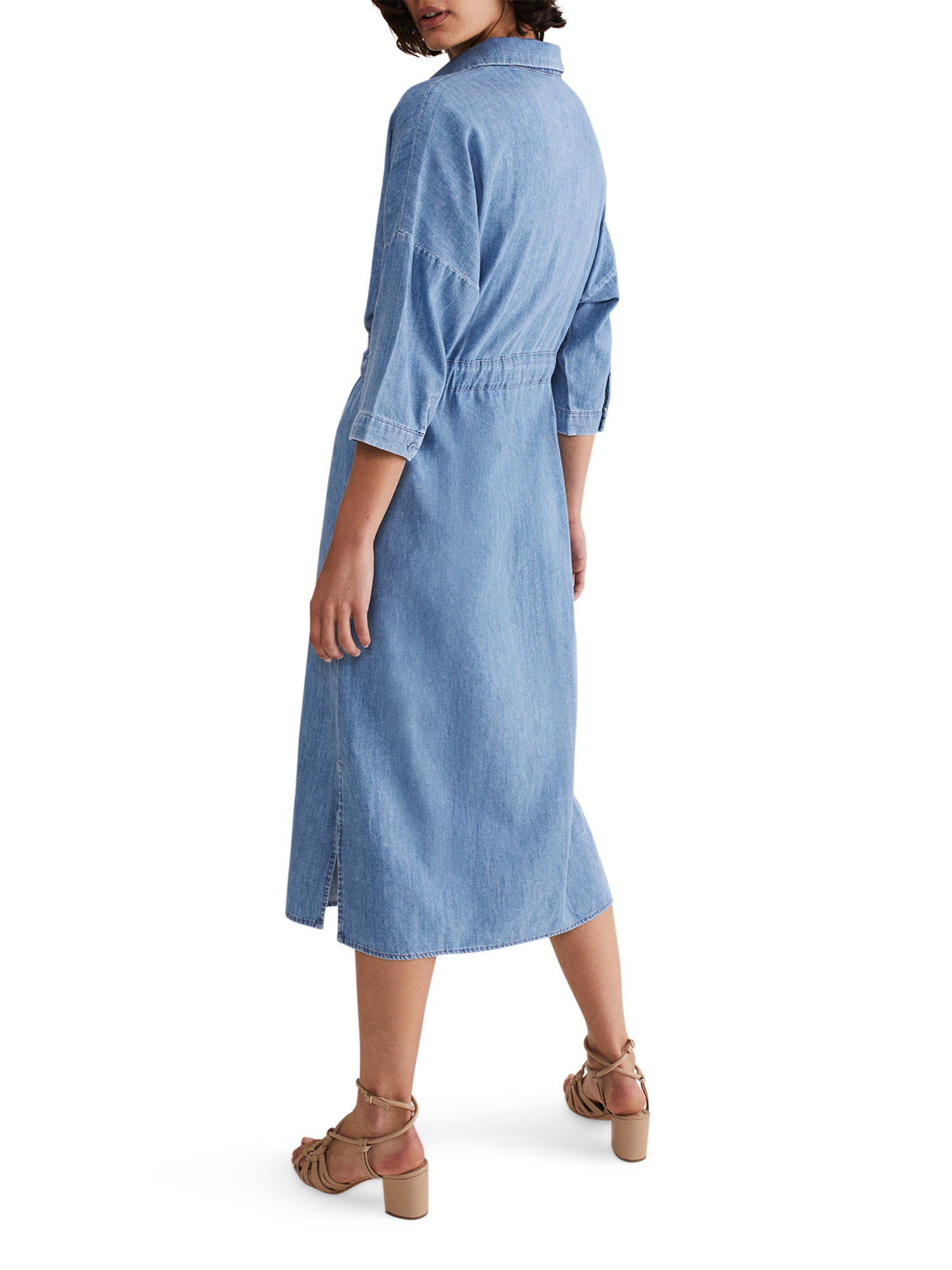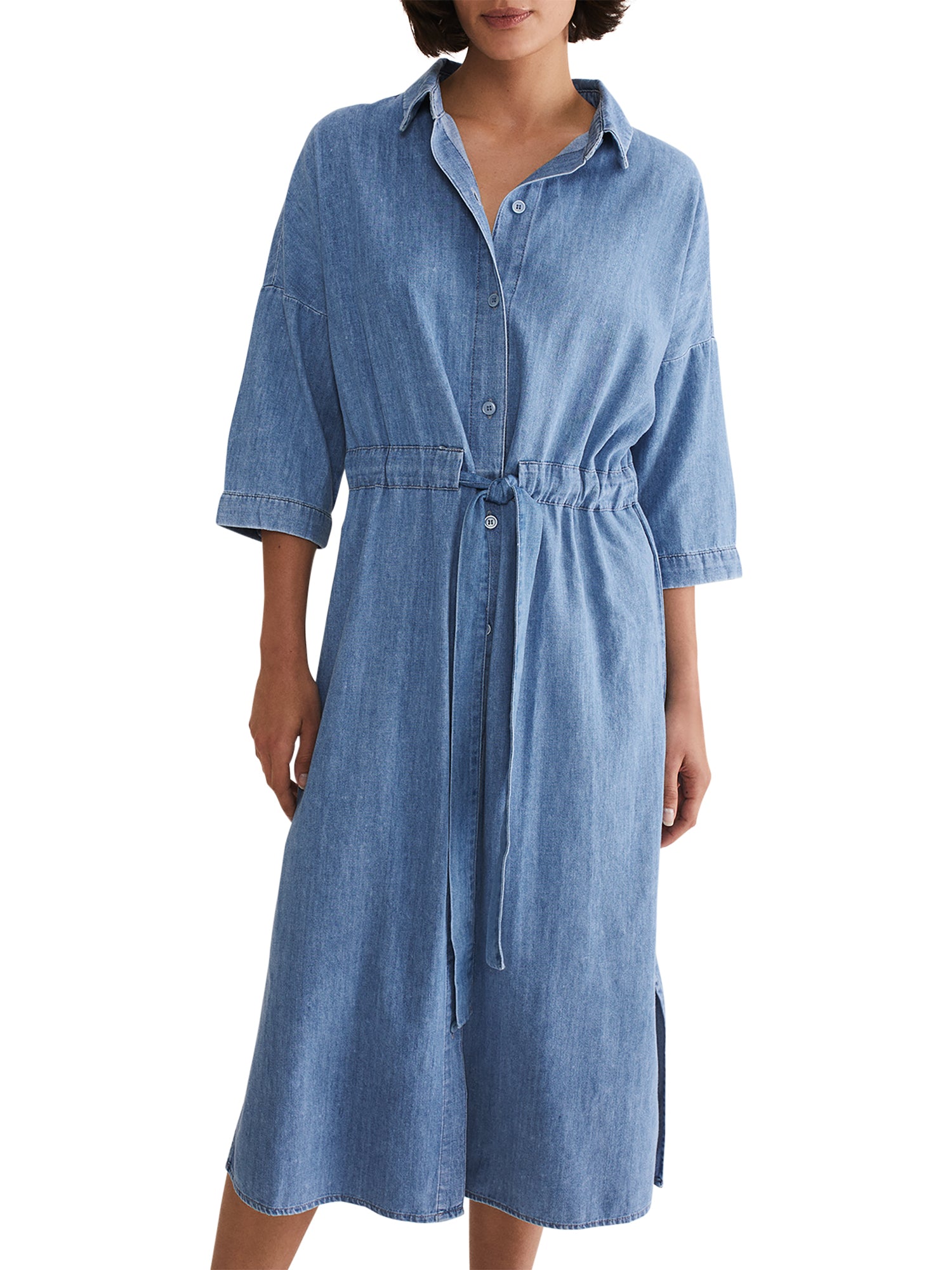 Embrace the casual elegance of the Tilda Chambray Dress, perfect for weekend outings and relaxed get-togethers.